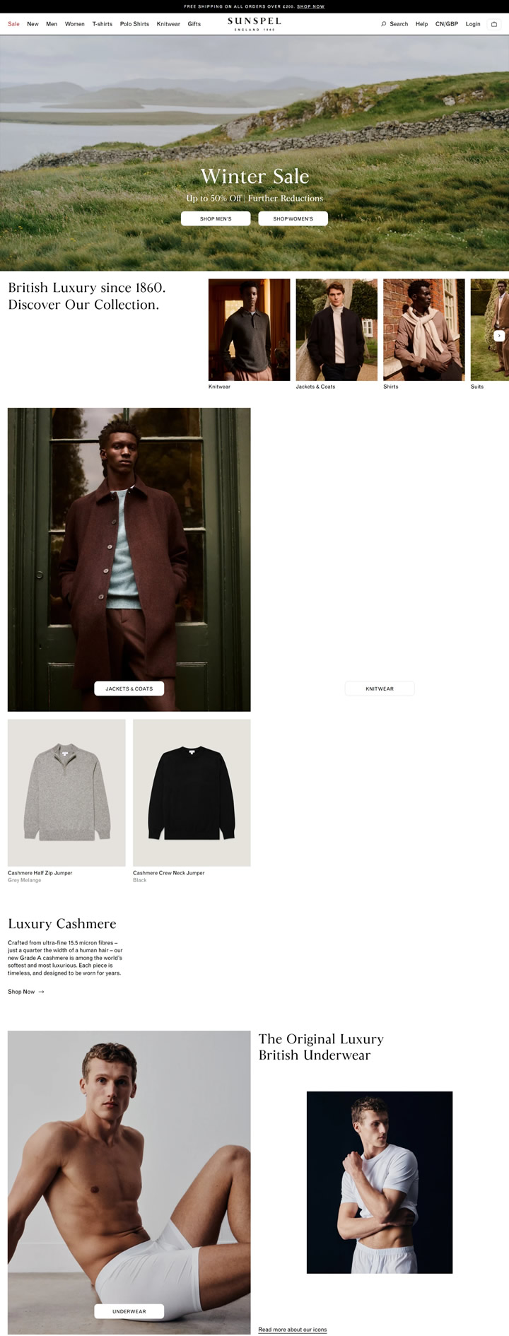 Sunspel是一个创立于1860年的英国奢侈男装品牌。他们采用包括世界上最稀有的棉质面料——海岛棉在内的顶级面料,打造永不过时的经典单品。其畅销的标志性产品包括:百年传承至今仍在英国工厂生产的经典T恤;曾为丹尼尔·克雷格饰演的詹姆斯·邦德量身定制的Riviera Polo衫;以及于1947年引入英国的经典平角内裤。